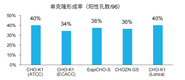 采用有限稀释法(0.5 cells/ 孔)铺板,结果显示在CHO-K1、ExpiCHO-S和CHOZN等细胞株中,平均单克隆形成率达到34%~40%。表明RapidExpan CHO克隆培养基能够高效支持不同CHO细胞株的单细胞生长与克隆形成。