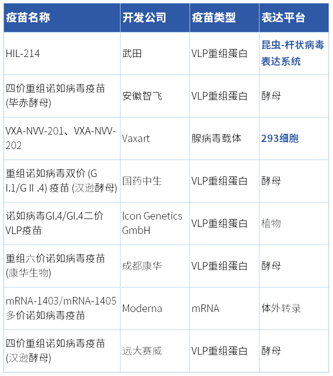 目前全球有8款诺如病毒疫苗处于临床阶段,其中6款是重组蛋白疫苗(VLP疫苗),1款腺病毒载体疫苗,1款mRNA疫苗。生产平台包括酵母、昆虫-杆状病毒表达系统、293细胞和体外转录(如下表)。