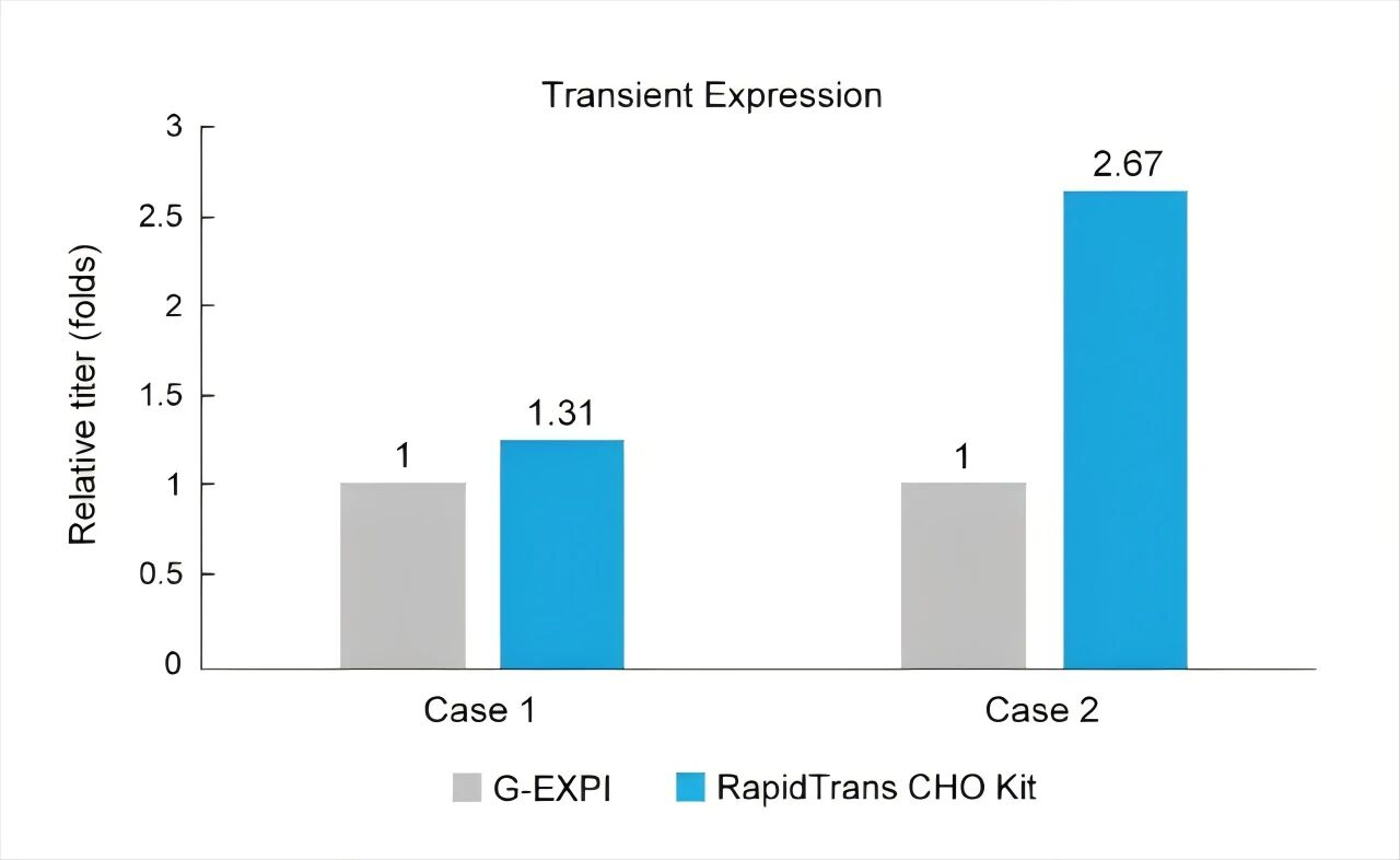 在不同瞬时表达项目中,RapidTrans CHO Kit均表现优异。在以下2个案例中,细胞为CHO-S,蛋白类型为单抗,在Day 9 收获蛋白。结果显示,与进口品牌相比,RapidTrans CHO Kit的抗体产量显著提高。