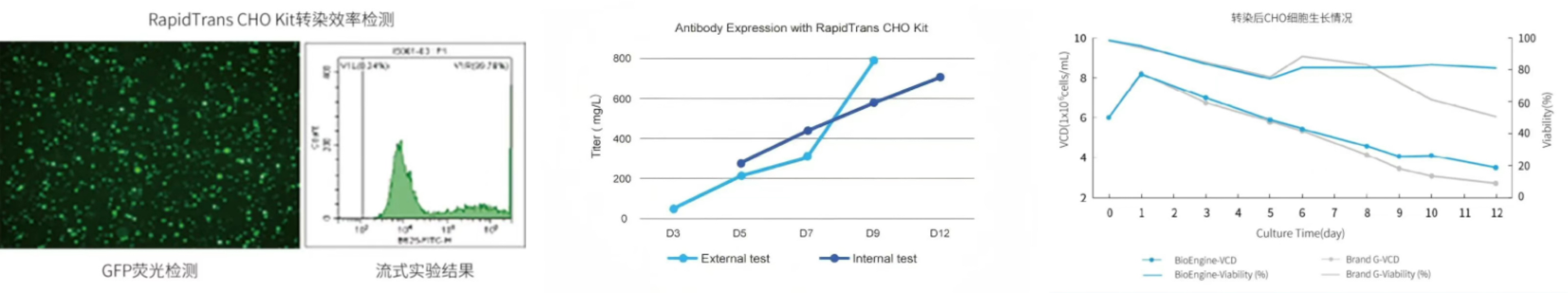 转染效率高,VCD和细胞活率更优,且蛋白产量较进口品牌显著提高。