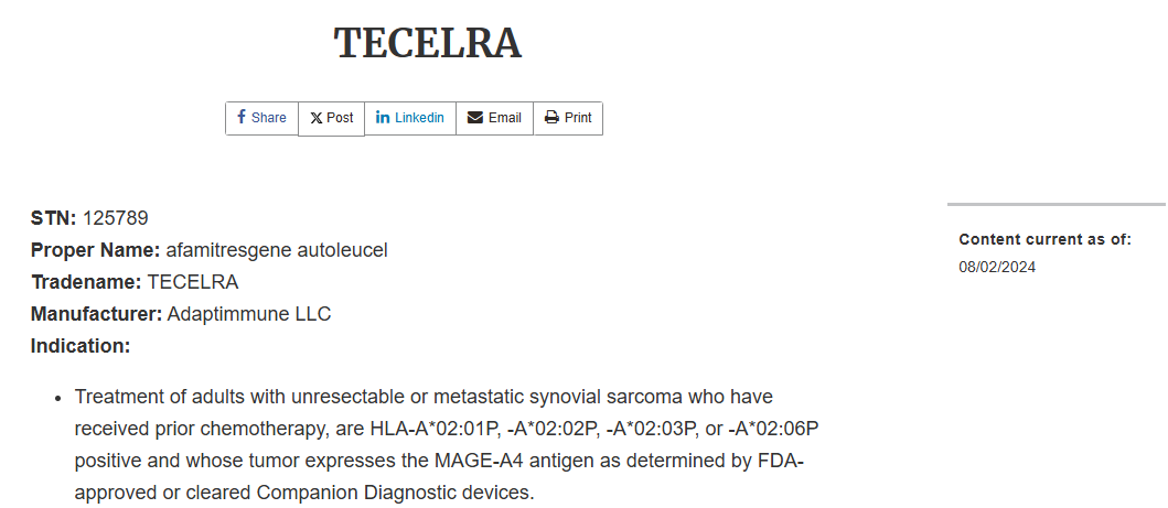 近日,Adaptimmune宣布,美国食品药品监督管理局(FDA)已加速批准其TCR-T疗法Tecelra(Afamitresgene autoleucel,Afami-cel)上市,用于二线治疗既往接受过化疗治疗的不可切除或转移性滑膜肉瘤成人患者。