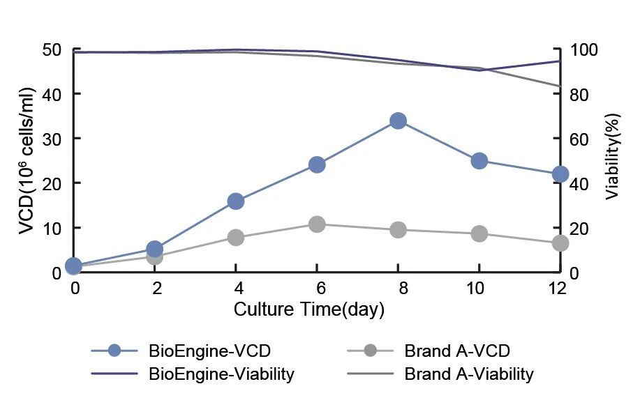 细胞生长速率、最大活细胞密度以及收获时细胞的活率均显著高于同类进口品牌A水平。