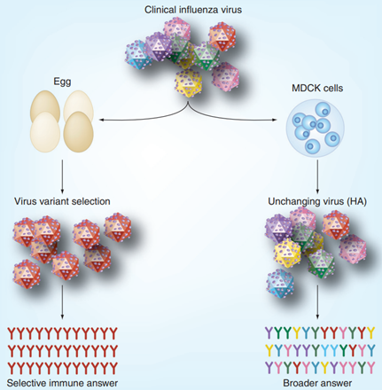 除此之外,鸡蛋中培养的流感病毒可能会发生适应鸡蛋的基因突变,包括抗原HA的突变,这有助于病毒在鸡蛋中的感染和复制,但导致与最初临床分离的病毒不完全一致,疫苗效力可能会下降。但在MDCK(Madin–Darby canine kidney)细胞中尚未观察到细胞特异性的适应性突变,与最初临床分离的病毒一致,确保了疫苗的效力(如上图)。因此使用动物细胞培养生产流感疫苗得到了越来越多的关注和应用,正在逐步取代传统的基于鸡胚的生产工艺。