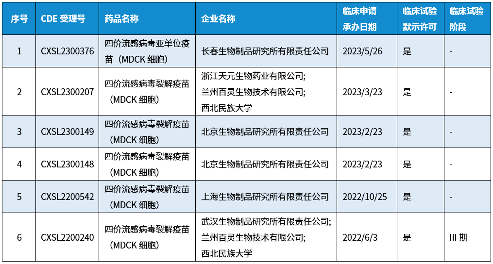 选择用于生产灭活流感疫苗的细胞系时,细胞系必须对多种流感病毒具有感染性并支持高滴度病毒复制。MDCK细胞对目前已知的所有流感疫苗病毒,包括禽流感、猪流感和马流感株都具有易感性,并且可以获得高病毒产量,大部分基于细胞培养的流感疫苗的制造商会选择MDCK细胞,例如例如Solvay、Seqirus(原Novartis)和SK Chemicals等公司已成功推出基于MDCK细胞的流感疫苗,分别在荷兰(2001年)、美国FDA(2016)和韩国(2015年)获批上市。目前我国还没有基于细胞培养的流感疫苗获批上市,但已有多家疫苗企业布局MDCK细胞基质流感疫苗生产并已有获批进入临床阶段(如下图)。