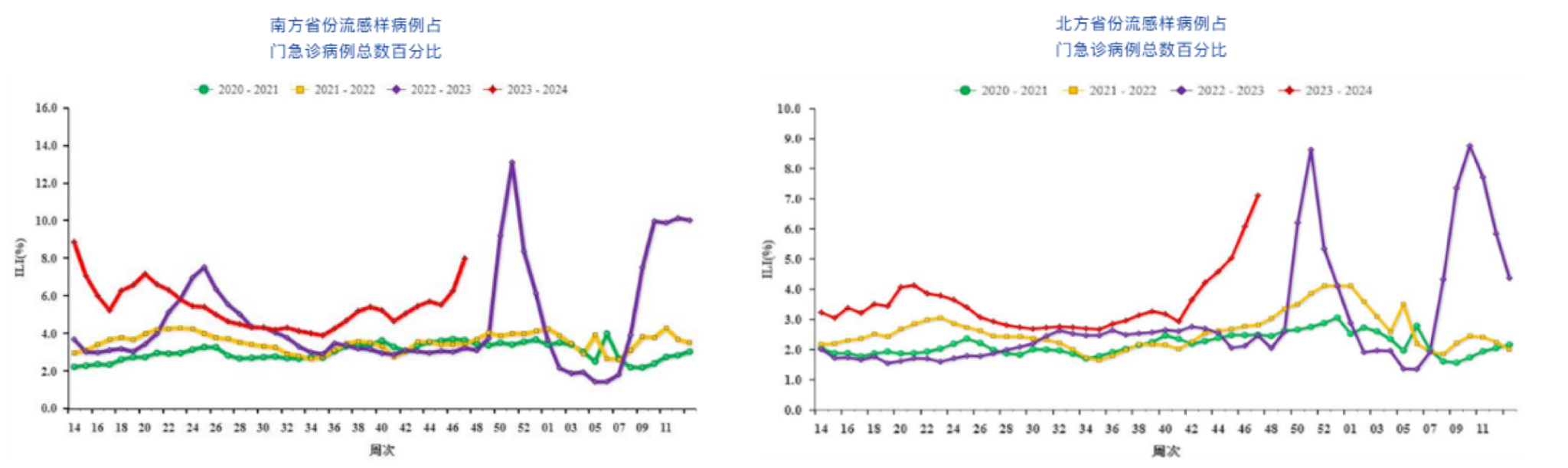 近期,呼吸道疾病进入高发时期,流感、新冠、支原体、RSV和腺病毒等多种病原体叠加,以流感为主。根据我国国家流感中心编制的流感监测周报2023年第47周(2023.11.20~2023.11.26)的数据,南方和北方省份流感样病例比例分别为8.0%和7.1%,显著高于往年同期(如下表),并成上升趋势(如下图)。