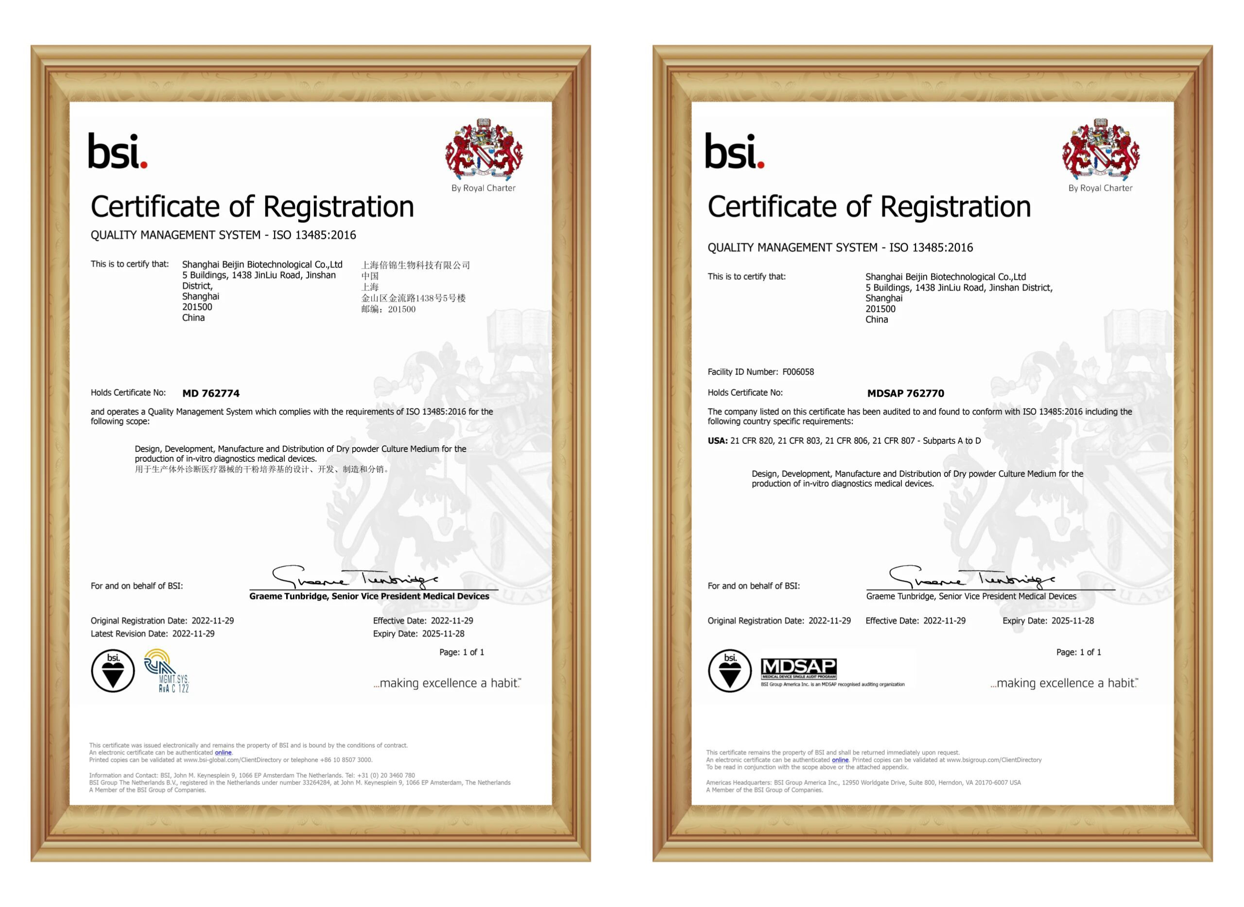 倍谙基的生产基地建设,率先实施信息化管理,配置了五大信息化系统和从原料到成品的全面检测流程,实现数据的唯一源性和可追溯性,最大限度地规避了生产过程中的人为错误。不仅能够预防质量事故的发生,还保证了数据的合规性和可追溯性,帮助客户轻松应对各地法规的要求。倍谙基还领先通过权威机构获取了ISO13485:2016和MDSAP等国际质量体系认证证书,满足不同国家法规的要求,让客户能够从容面对审查和准入要求。