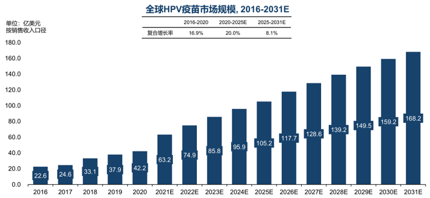 从2016年至2020年,全球HPV疫苗市场规模从22.6亿美元增长至42.2亿美元,年复合增长率为16.9%,这主要受到发达国家HPV接种率提升的推动。根据2020年的数据,全球适合接种HPV疫苗的女性(9-45岁)人数为20.56亿人,当前的接种率不足10%,如要达到90%的接种率,需要约52.7亿剂疫苗,但现有的疫苗供应量远远不够。预测到2025年和2031年,全球HPV疫苗市场规模将分别达到1052亿美元和1682亿美元,年复合增长率分别为20.0%和8.1%。