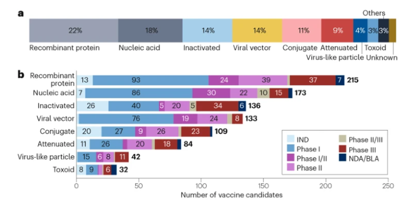 新冠疫情增加了对疫苗研究的关注,疫苗的技术平台成多样性发展,从全球范围内疫苗管线来看,传统技术平台灭活疫苗(Inactivated)和减毒活疫苗(Attenuated)分别占比14%和9%。但不容忽视的是,随着对疫苗认识的加深和基因工程等技术的发展,以及新冠疫苗成功案例的加持,其他技术平台也得到快速发展。