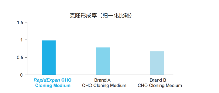 以RapidExpan CHO克隆培养基的克隆形成率为基准(归一化处理)进行比较。使用ATCC CHO-K1细胞株铺板,在Day11,RapidExpan CHO克隆培养基的克隆形成率显著高于其他品牌培养基。