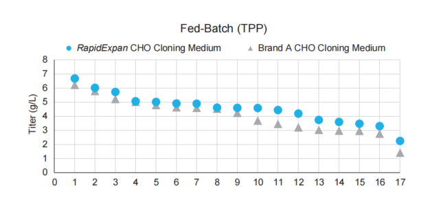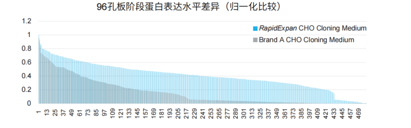 通过Gator进行的产量分析,RapidExpan CHO克隆培养基(day 15)的上清产量显著优于Brand A培养基(day 21)。同时,两组各筛选出的前17个高表达克隆,使用Eden B101 Ultra套组流加培养评价表达量,所有克隆产量均优于Brand A 。以上数据表明RapidExpan CHO克隆培养基在筛选效率、项目周期和克隆产量三个关键维度均具有显著优势。
