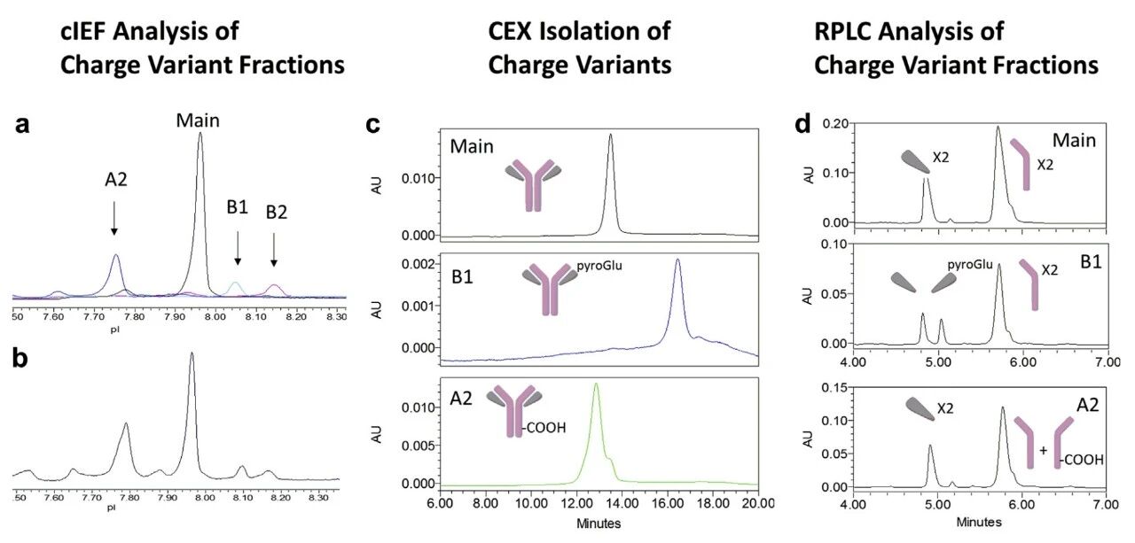 碱性异构体则通常与C末端赖氨酸的保留、脯氨酸酰胺化以及N端谷氨酸(Glu)环化相关。例如,N端谷氨酸(Glu)环化为焦谷氨酸(pyroGlu)是抗体中常见的翻译后修饰,实际上是一种碱性变体,需关注培养和储存条件(如温度、pH),以延缓环化反应2。