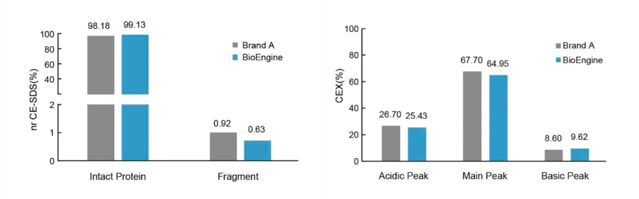 蛋白表达量相比同类进口品牌A提升2倍,同时产物电荷分布、片段化等质量属性均满足客户要求,显著降低客户生产成本。