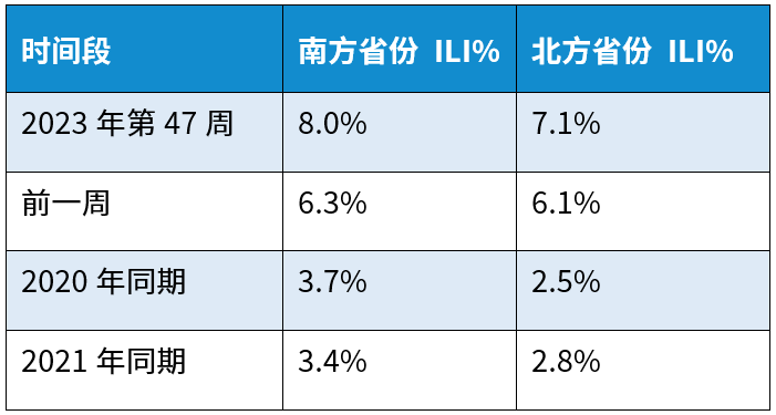近期,呼吸道疾病进入高发时期,流感、新冠、支原体、RSV和腺病毒等多种病原体叠加,以流感为主。根据我国国家流感中心编制的流感监测周报2023年第47周(2023.11.20~2023.11.26)的数据,南方和北方省份流感样病例比例分别为8.0%和7.1%,显著高于往年同期(如下表),并成上升趋势(如下图)。
