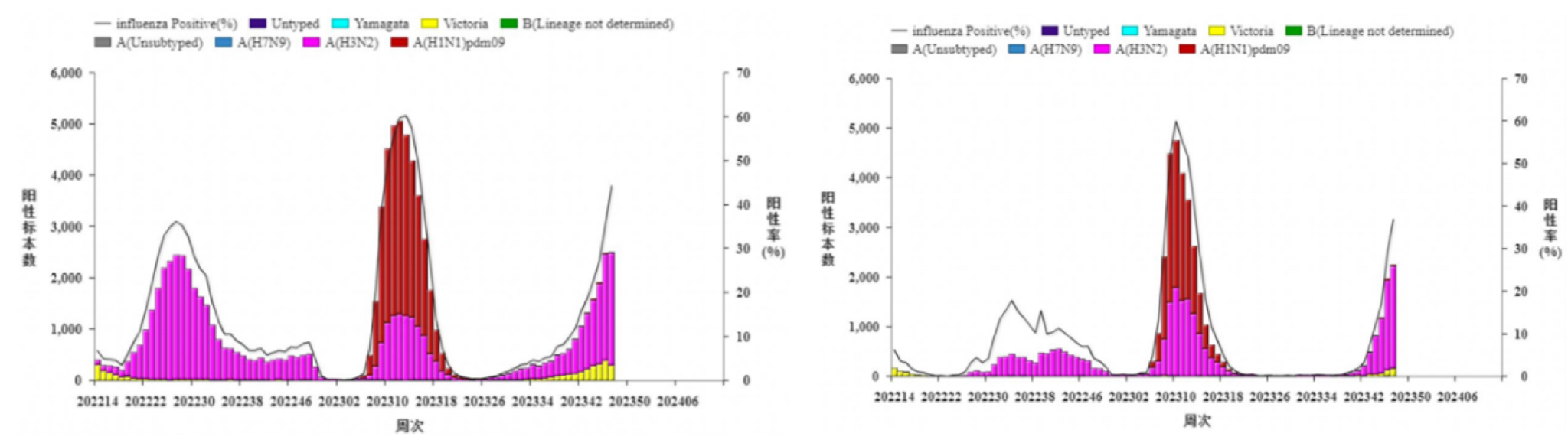 同时对流感样病例样本检测显示流感病毒检测阳性率也持续上升,南方和北方省份阳性率分别为44.3%和36.9%,均以A(H3N2)亚型为主,其次为B(Victoria)系(如下表和下图)。