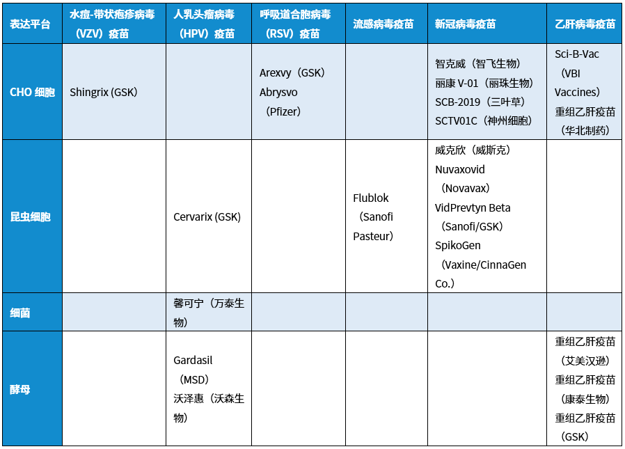 目前HPV疫苗均是采用重组蛋白技术生产的VLP疫苗,只是表达平台不同(详见下表)。