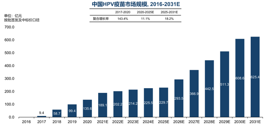 对于中国,2020年适合接种HPV疫苗的女性(9-45岁)人数为3.15亿人,如要达到90%接种率所需的疫苗约为7.7亿剂,远超过当年的供应量(约1500万剂)。中国的2020年的累计接种率达到3.61%,接种率与发达国家仍存在较大差距。从2017年到2020年,中国的HPV疫苗市场规模从9.4亿元增长至135.6亿元,年复合增长率达到143.4%。到2025年预计达到229.7亿元,年复合增长率11.1%。随着本土高价数HPV疫苗上市和男性接种市场的潜力开启,预计中国的HPV疫苗市场将在2025年后进入高速增长期,到2031年市场规模预计达到625.4亿元,年复合增长率18.2%。