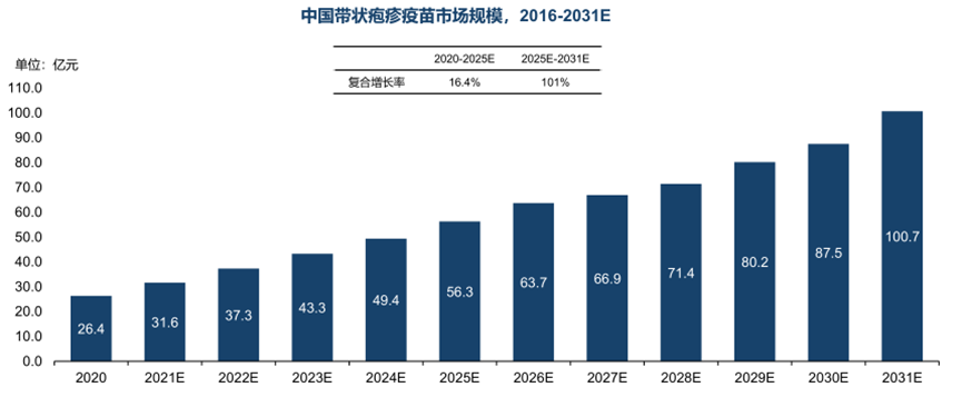 2020年美国≥50岁和≥60岁人群接种覆盖率分别为29.4%和39.1%;英国≥70岁人群接种覆盖率40.6%。而中国接接种率仅为0.2%左右,中国的带状疱疹疫苗接种率相对于欧美等国家还存在较大差距,相信随着更多国产厂家获得批准并上市,大众对疫苗的更多认识,预计市场规模将进一步增长。据Frost & Sullivan预测,到2031年中国带状疱疹疫苗市场规模将达百亿。
